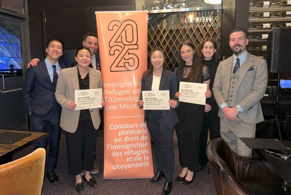 TRU Law continued its strong showing at the Immigration, Refugee, and Citizenship Moot, held in Toronto from February 27 to March 1, achieving second place for the overall written factum. Team members included Lauren Da Silva, Mackenzie Do, Allan Hsu, Celina Lin and Sepideh Sadeghi.