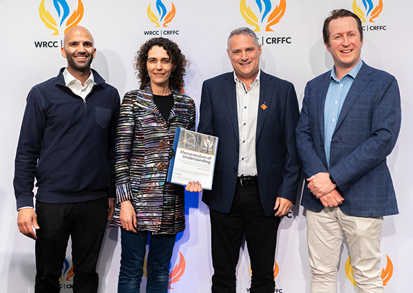 Signing the MOU (L-R): Dinyar Minocher, director, TRU Wildfire Research, Innovation and Education; Marta Yebra, director Bushfire Research Centre of Excellence, Australia; Garnet Mierau, executive director, WRCC; Andrew Gissing, chief executive officer, Natural Hazards Research, Australia.