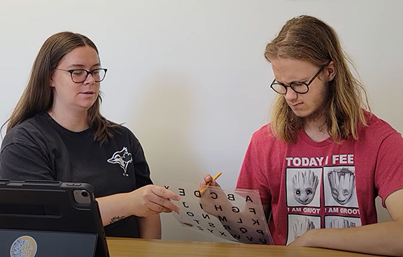 Through the letterboard, Luke points to the letters one at a time, usually with a pencil. The practitioner helps teach him how to guide his eyes and his arm.