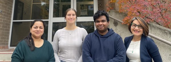 Pictured left to right: TRU faculty member Dr. Anusha Venkataraman, microbiology student Emma Trotta, physics student Nuwan Ambagahawatta and faculty member Dr. Naowarat (Ann) Cheeptham