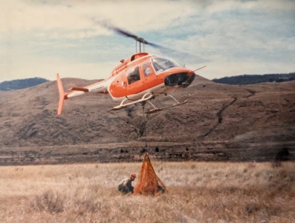 A helicopter transports Dr. Anderson and equipment from a post-fire staging area, carrying him and the crew on to their next assignment.